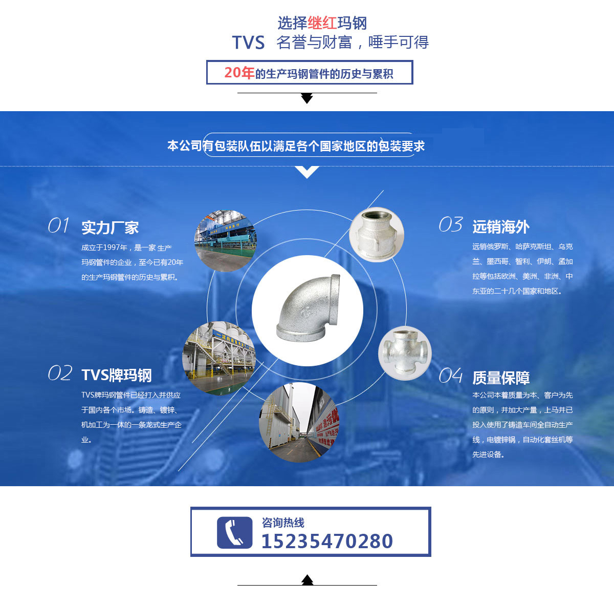 太谷繼紅瑪鋼鑄造有限責(zé)任公司座落于山西省太谷縣胡村瑪鋼工業(yè)園區(qū),成立于1997年,是一家專業(yè)生產(chǎn)瑪鋼管件的企業(yè),至今已有20年的生產(chǎn)瑪鋼管件的歷史與累積。其中,本公司在出口外貿(mào)瑪鋼管件方面尤其專業(yè)并具有相當(dāng)大的優(yōu)勢,長年生產(chǎn)的德標(biāo)管件、美標(biāo)管件、英標(biāo)管件遠銷俄羅斯、哈薩克斯坦、烏克蘭、墨西哥、智利、伊朗、孟加拉等包括歐洲、美洲、非洲、中東亞的二十幾個國家和地區(qū)。
